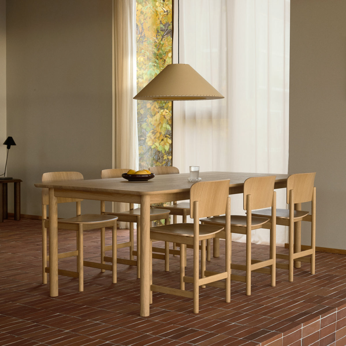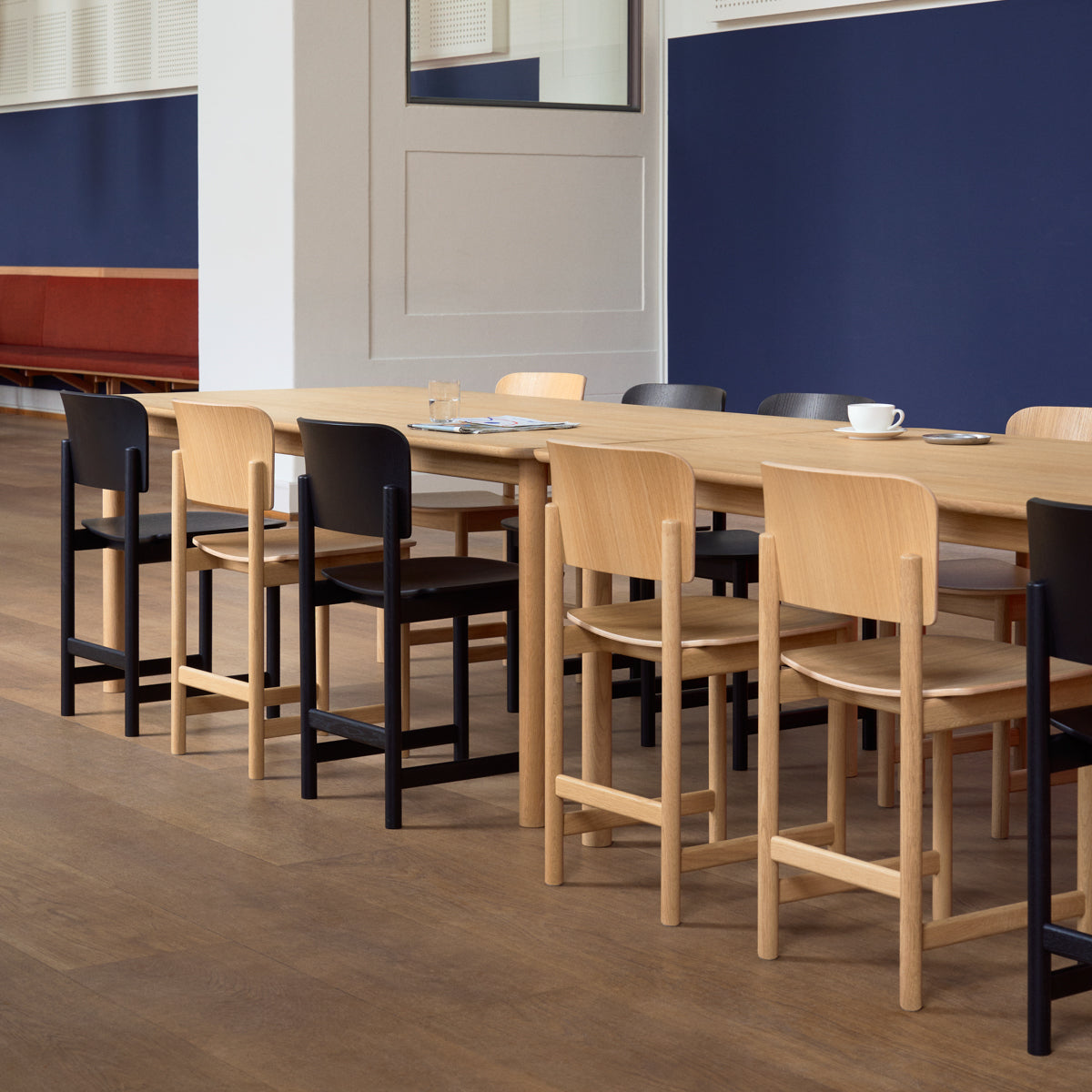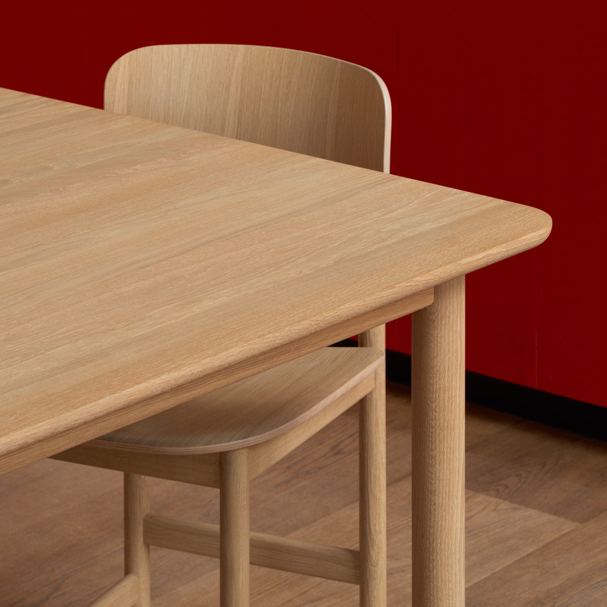 The Plan Wood Table with fixed dimensions is a simple four-legged design suited to smaller spaces or needs, functioning as a dining table, a home-office solution, or an intimate meeting table. The base is crafted from solid wood, and the tabletop is available in a range of materials, including solid oak, offering a warm and functional character. The table can be equipped with cable management, allowing cables to run discreetly through a milled groove in the leg, finished with a lid in black metal or surplus core leather. A timeless and versatile table that unites functionality with our strong heritage of wood craftsmanship.