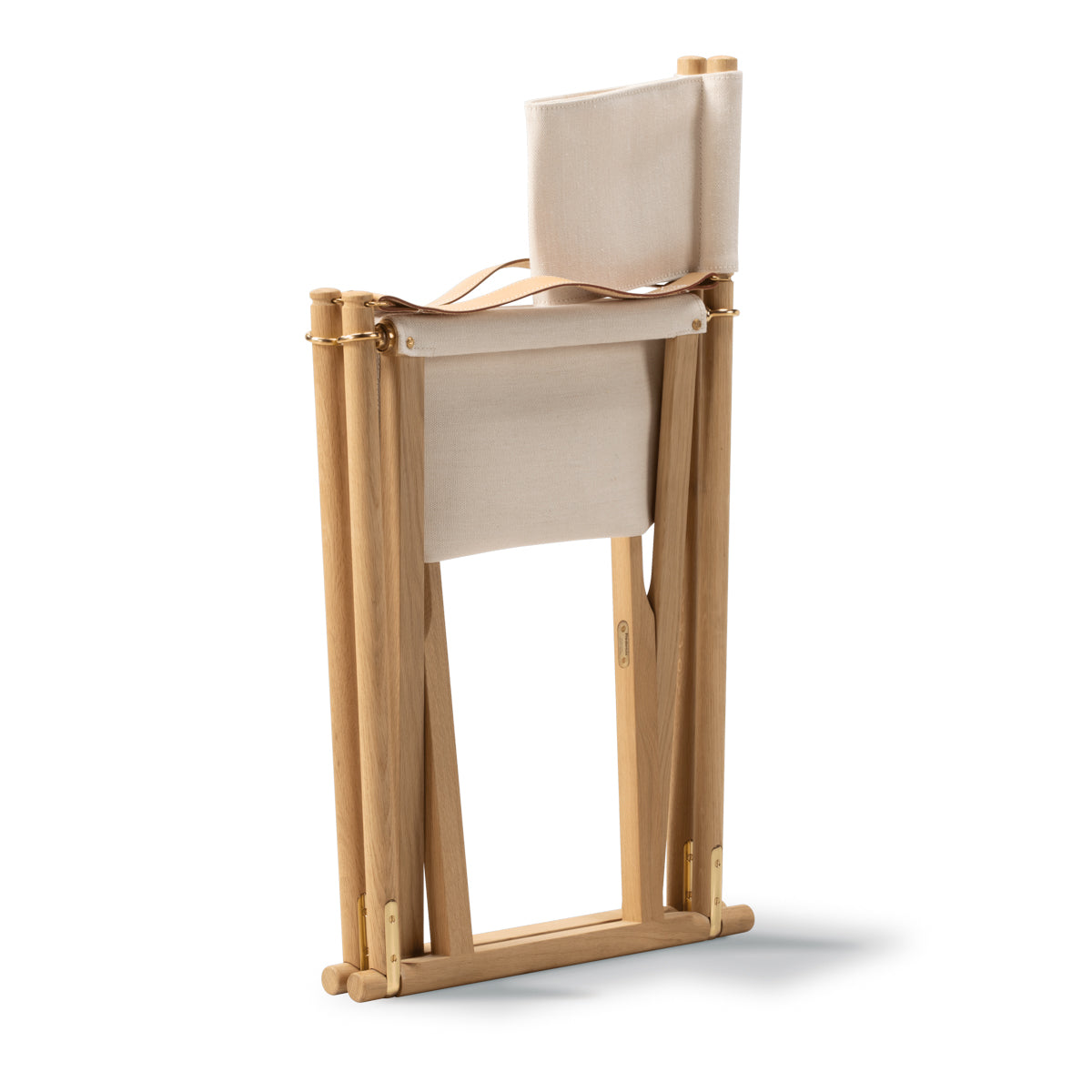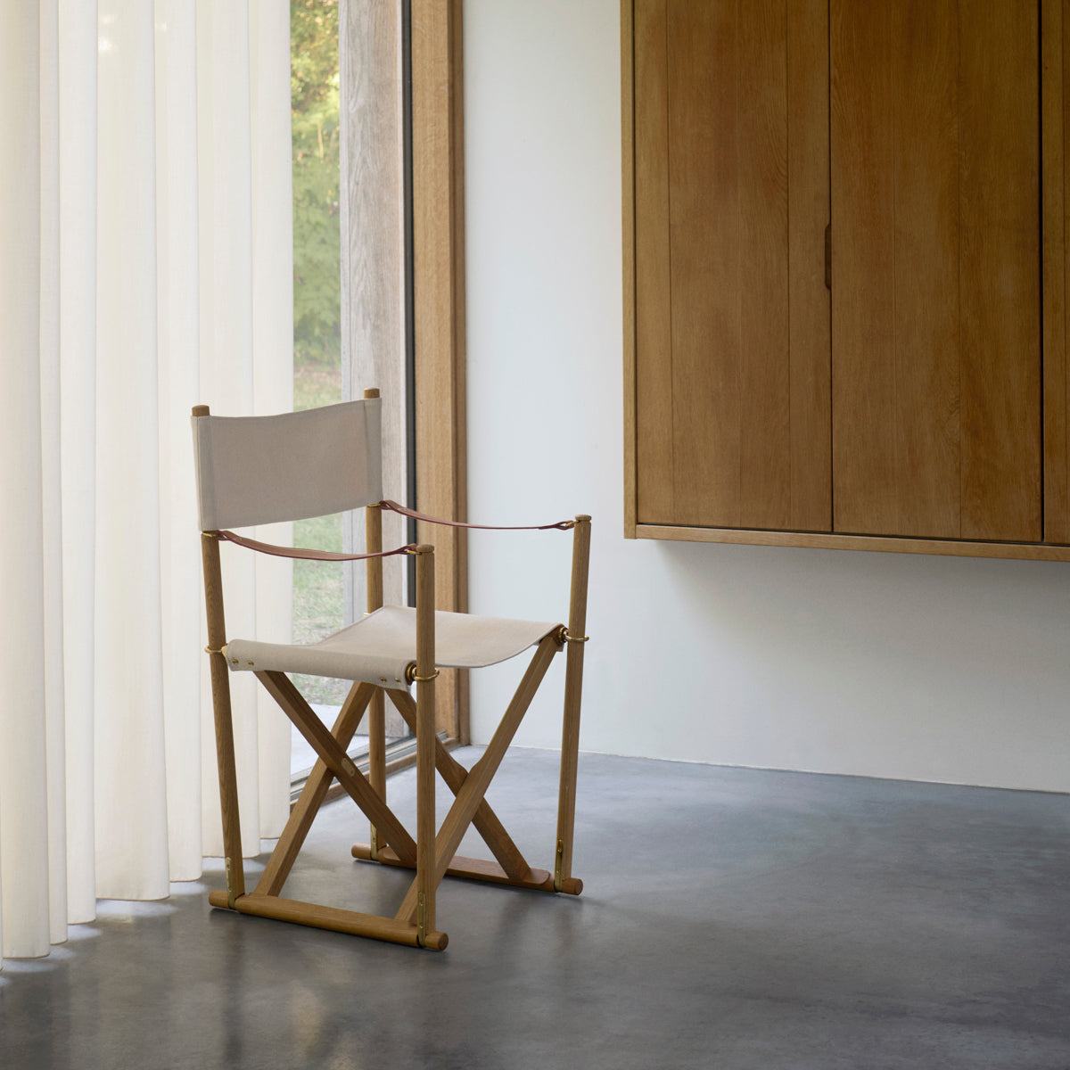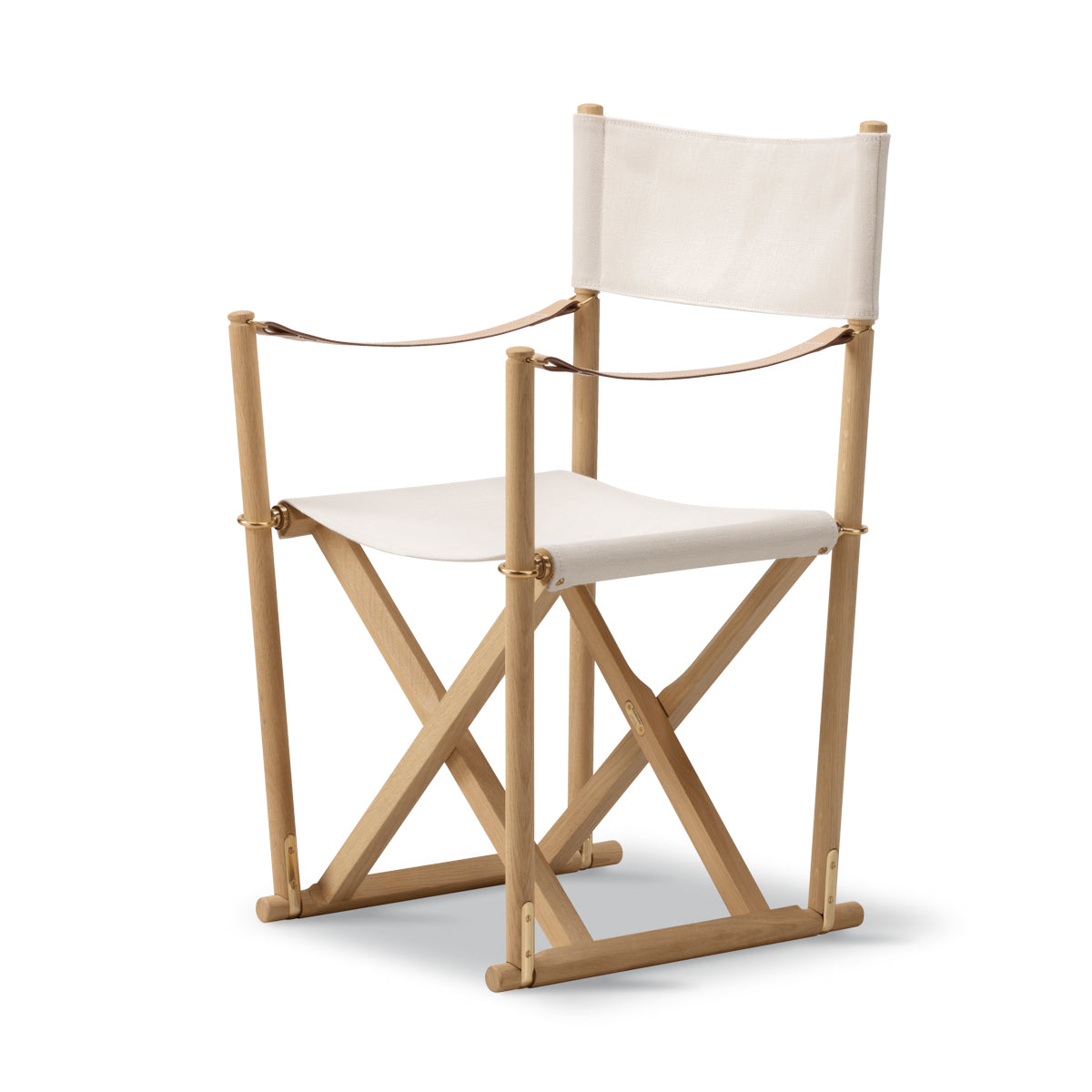 Crafted in solid wood with saddle leather armrests, an off-white cotton canvas seat, and solid brass fittings, the MK16 Folding Chair represents a timeless design where craftsmanship, materials, and function exist in quiet balance.
